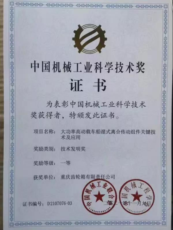 喜報!中國船舶集團旗下中國動力子公司重齒公司榮獲中國機械工業科學技術獎技術發明類一等獎!