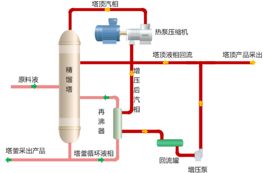 該項目使用熱泵壓縮機對精餾塔頂氣進行增壓,以提高其溫度品位,再將其送往塔釜再沸器作為熱源使用,替代原本蒸汽熱源,從而大幅減少一次蒸汽以及塔頂冷卻水耗量,從工藝上實現精餾過程的節能減碳。