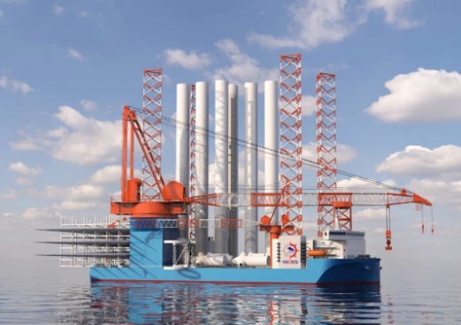 三是作業能力強。該平臺建成后主要用于16MW 及以上機組設備安裝,配置4個三角形桁架式樁腿(樁腿長度125.85米)、4套齒輪齒條式升降系統和沖樁系統,單樁額定升降能力約9000噸。該平臺相較一般風電安裝平臺,作業能力更強,作業范圍更廣,并且可以輕松應對更加惡劣的施工環境,是滿足未來深遠海、大容量、一體化施工作業要求的海上風電施工裝備。