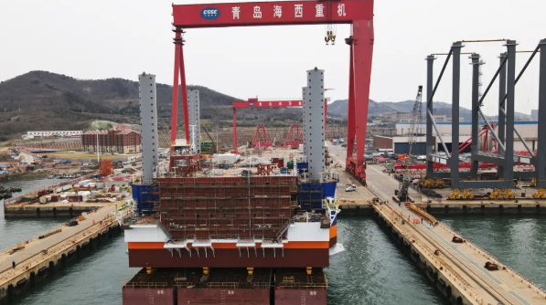 2022年4 月16日上午,中國船舶集團旗下中國動力子公司武漢船機海西重機碼頭,總重約6000噸馬國油MOPU平臺緩緩脫離浮箱小車,四條樁腿站立碼頭附近海域,標(biāo)志著該平臺完成下水里程碑節(jié)點。